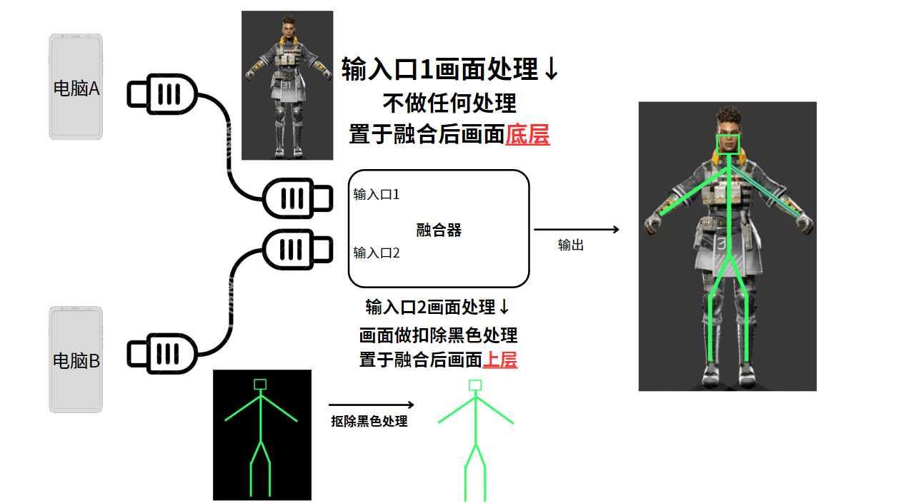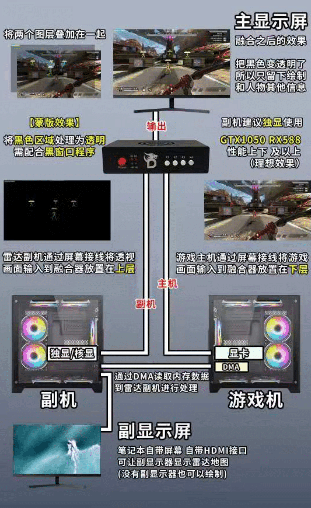 透视: 副机上的辅助分析出的透视画面再通过融合器,融合到游戏机画面上从而实现透视。(原理参照下文融合器介绍)
